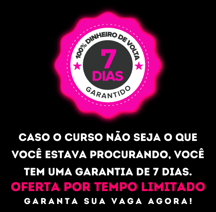Isso é, se dentro de 7 dias, por qualquer motivo você achar que o Curso não é bom, que não supriu suas espectativas ou que não compesou o seu Investiemento, você pode solicitar junto a Plataforma da KIWIFY a devolução do valor total que você pagou, que ele será devolvido.