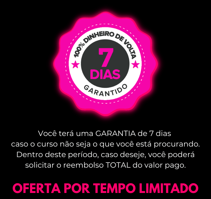 Isso é, se dentro de 7 dias, por qualquer motivo você achar que o Curso não é bom, que não supriu suas espectativas ou que não compesou o seu Investiemento, você pode solicitar junto a Plataforma da KIWIFY a devolução do valor total que você pagou, que ele será devolvido.